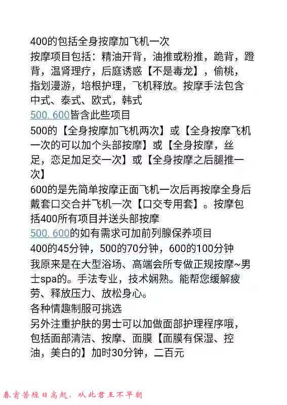 做按摩的,项目分的很细,足交里我觉得不错的,脚也很嫩,最后我是口里嗦这脚趾射的,很爽。