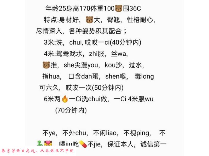 才回来不久,之前约过一次,后果断了联系,现在跟我说回来了。技术可以,身材没的说,就是不接吻,不接受无