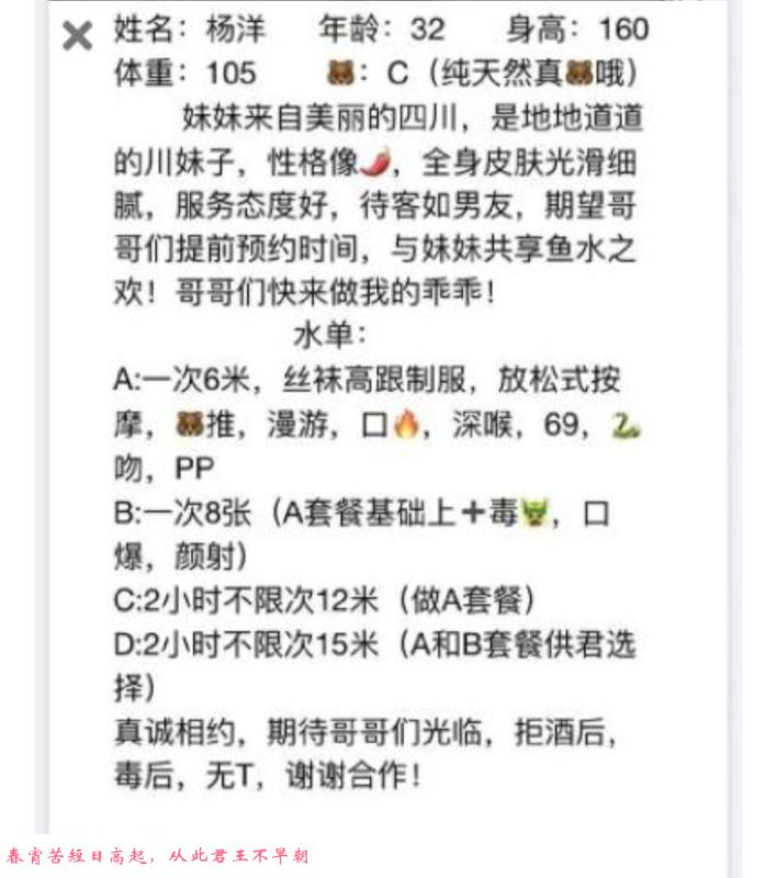 川妹子,之前加上几个月一直没时间去,有空遂去,卫生没啥问题,要求都能满足,妹子很有耐心,骚货下面水很