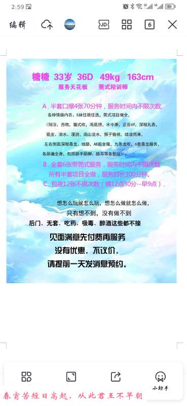 人照对版,皮肤很白很细腻,身材匀称,进门整体感觉很好,会热情的聊天,穿着也很性感,共浴之后,贴心的亲